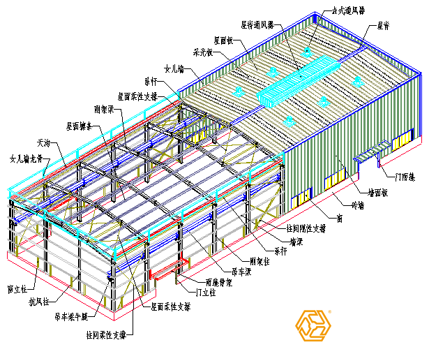 輕型鋼結構廠房屋面及墻面材料主要選彩色壓型板或夾芯板。常用的壓型鋼板規格主要有:YX25-205-820、YX51-470、YX76-380-7600、YX51-410-8200等板型,在這些板型中,既有360度卷邊板、暗扣板搭接連接,也有打釘板。檁條為自重較輕的薄壁C型或Z型鋼檁條,屋面坡度設計一般為1/10~1/15。